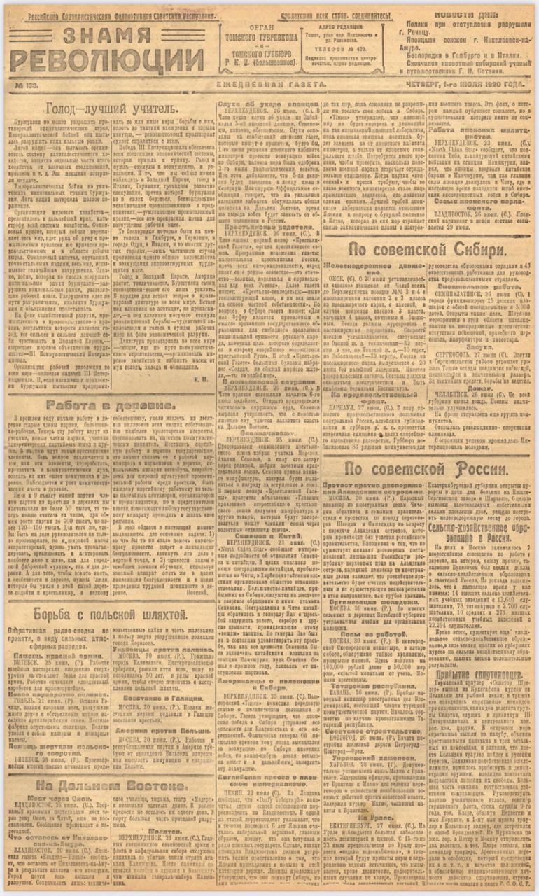 Григорий Николаевич Потанин, русский учёный, путешественник, общественный и политический деятель, идеолог сибирского областничества, был непримиримым врагом большевиков. 30 июня 1920 года в клиниках Томского университета после продолжительной болезни закончился его долгий и славный путь. Авторитет и слава этого человека в Сибири были так велики, что новая власть не обошла молчанием уход из жизни Потанина, несмотря на его антибольшевизм. В печатном органе Томского парткома газете «Знамя революции» были опубликованы извещения о смерти, времени панихиды, погребения Г.Н. Потанина, а также посвящённый ему довольно большой некролог. Впрочем, последний был написан в презрении обычая «о мёртвых или хорошо, или ничего», сугубо агитационно, с «классовой позиции». Потанин, которому отдавали должное как деятелю науки, был заклеймён как враг рабочих и крестьян, при этом антибольшевистская позиция учёного снисходительно «объяснялась» его преклонным возрастом и болезнями.