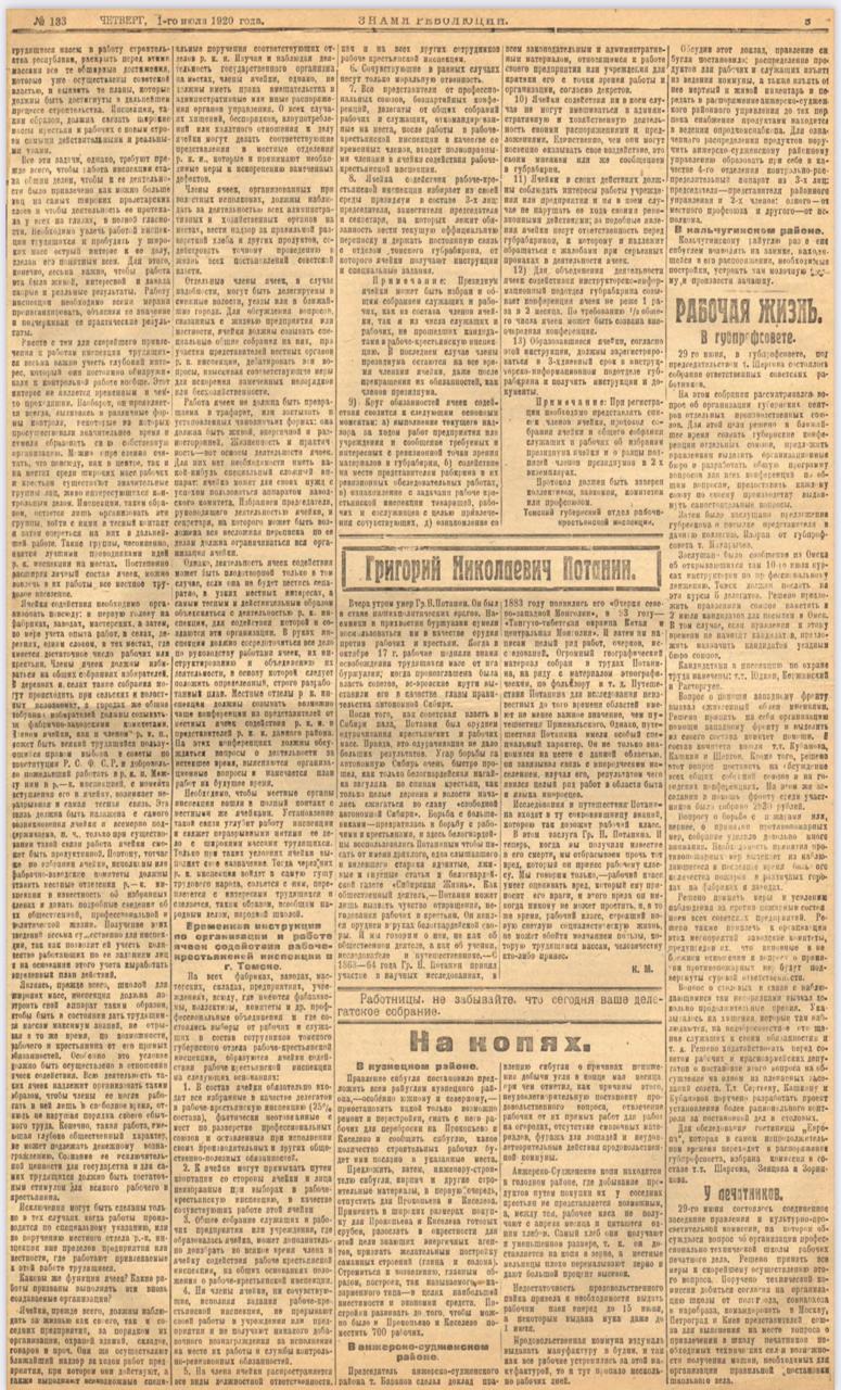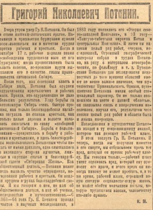 «Вчера утром умер Гр. Н. Потанин. Он был в стане наших политических врагов. Наёмники и прихвостни буржуазии сумели воспользоваться им в качестве орудия против рабочих и крестьян. Когда в октябре 17 г. рабочие подняли знамя освобождения трудящихся масс от ига буржуазии; когда провозглашена была власть советов, эсеровские круги выставили его в качестве главы правительства автономной Сибири.