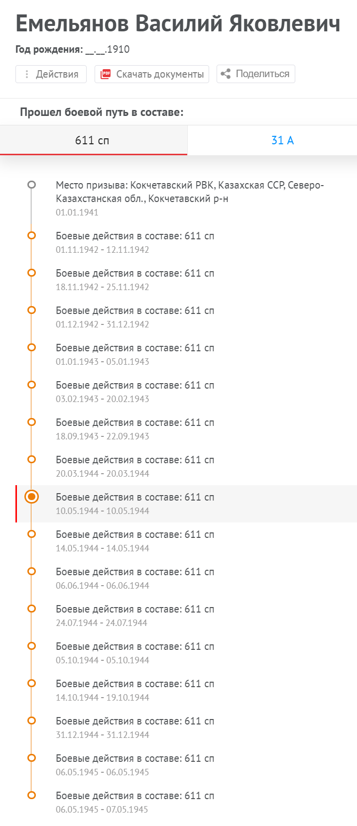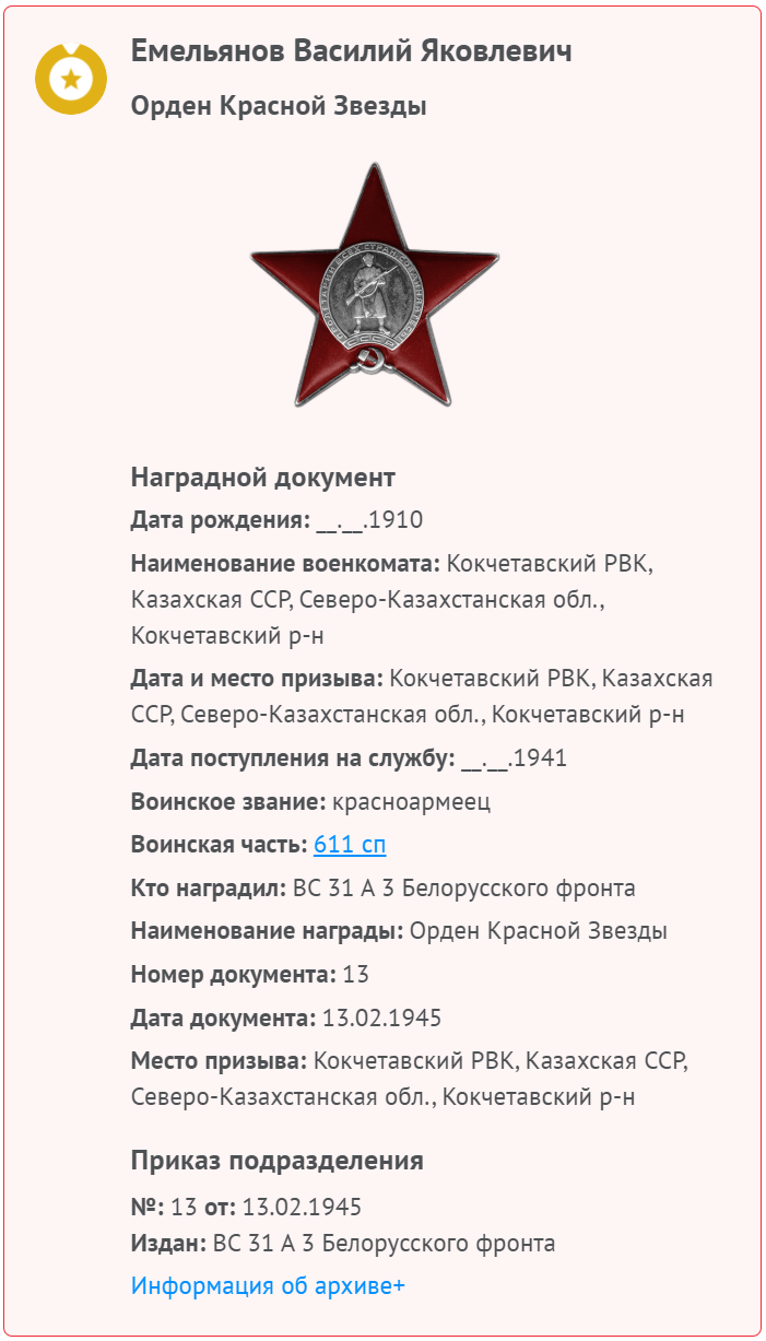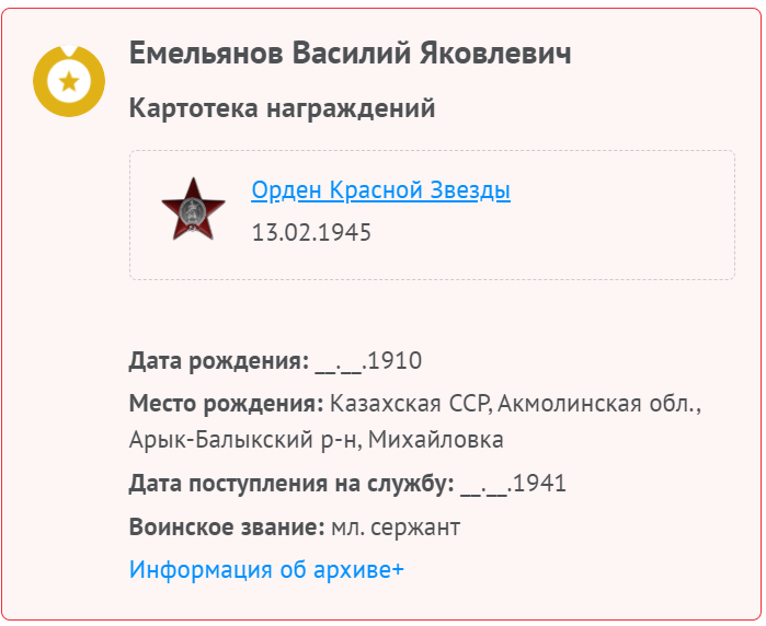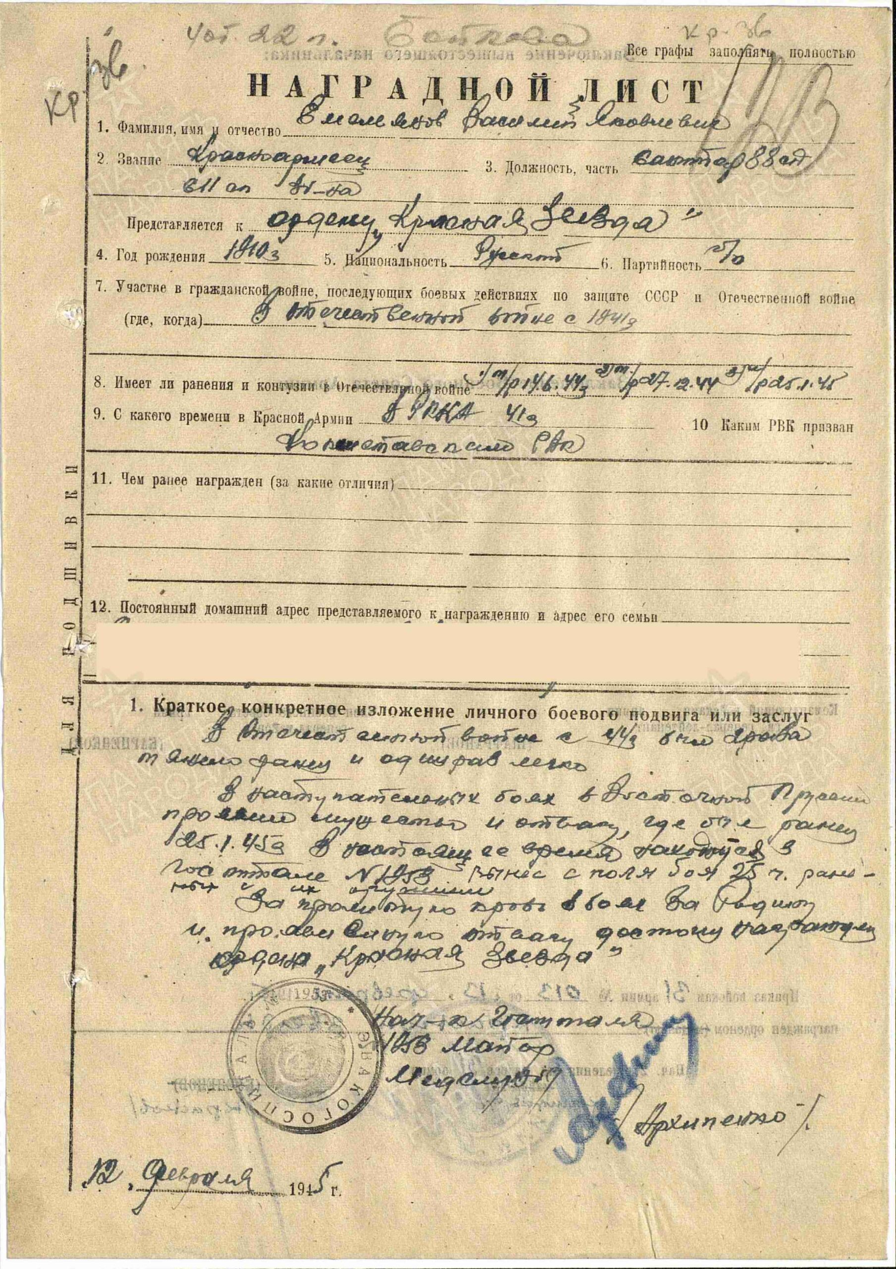 «… В наступательных боях в Восточной Пруссии проявил мужество и отвагу, где был ранен 25.01.1945. В настоящее время находится в госпитале №1953. Вынес с поля боя 25 человек раненых с их оружием…»