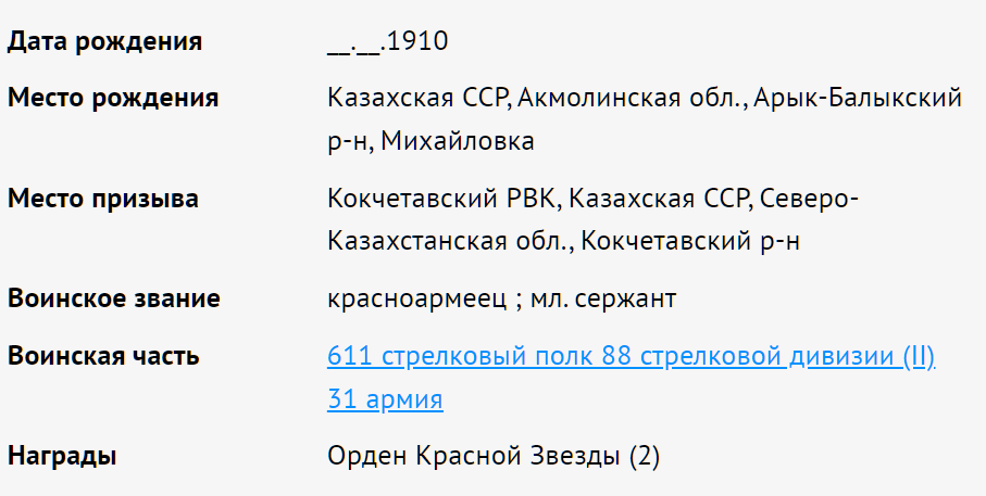 Призыв: Северо-Казахстанская область, г. Кокчетав, 1941