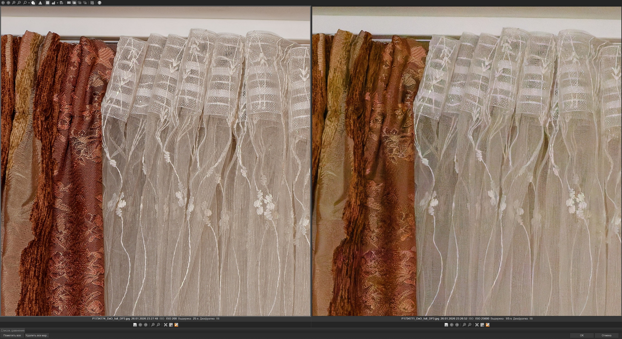 Для сравнения приложены RAW, камерный JPEG, JPEG после обработки в демоверсии DxO PhotoLab 8.7.1 с DeepPRIME 3 и DeepPRIME XD2, сравнительные изображения камерного и DxO JPEG с ISO200, 6400, 12800 и 25600, XMP файлы настроек к RAW .DOP, а также сравнительные скриншоты разных обработок. В EXIF сохранена вся информация.